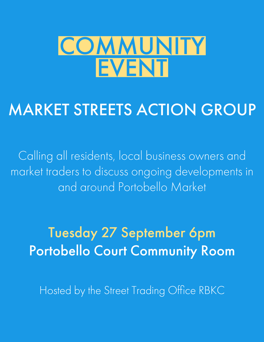 On Tuesday 27 September 6pm the Street Trading Office is hosting its quarterly Market Streets Action Group in Portobello Community Room. Residents, market traders, business owners and local community members are invited to come and participate at the meeting and to engage with the Council on ongoing developments in the area.